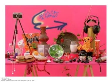À l’origine, les natures mortes rappelaient le caractère éphémère du monde des vivants – memento mori ; tracé dans une écriture kitsch, le mot « éternité » représenterait plutôt ici le paradoxe du monde contemporain.