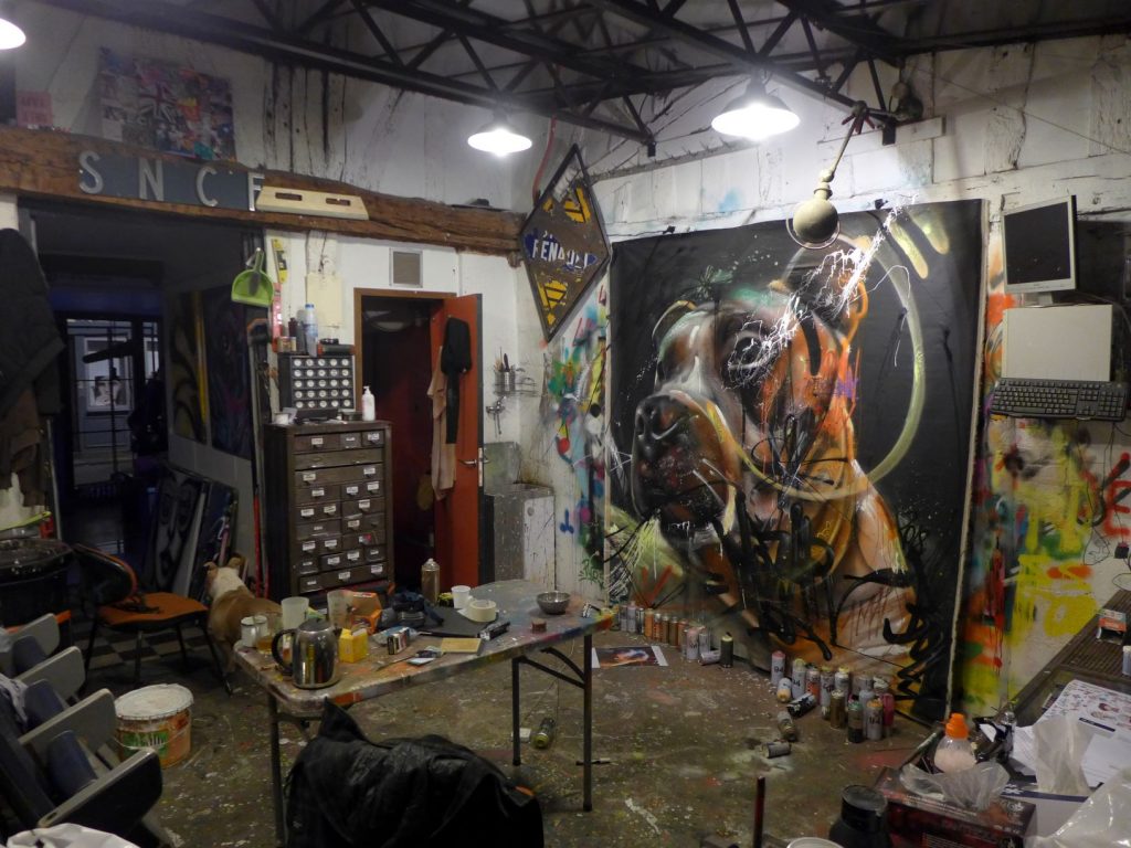 En atelier c’est plus réfléchi, minutieux, je travaille en série, je décline des variantes, j’utilise plusieurs médiums avec des temps de séchage différents, il faut donner le meilleur sur une plus petite surface, il y a aussi beaucoup d’expérimentations, c’est un autre sport que la rue, plus introspectif.