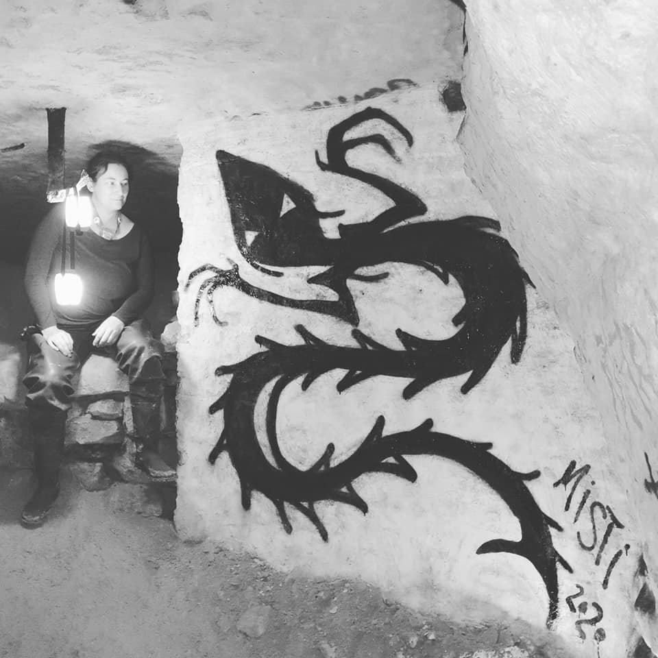 Déjà 27 ans de descente dans les catacombes pour Misti, une des rares femmes artistes cataphiles. Tout a commencé à 16 ans pour elle : une première descente adolescente qui a été une révélation. Depuis, elle n’a jamais cessé d’y retourner, une à deux fois par mois. Un lieu où cette louve solitaire, qui a du mal à se positionner dans un groupe, puise son énergie et se déconnecte de ce qui se passe à la surface, un lieu hors du temps, hors des sentiers battus qui colle à son besoin de se ressourcer, mais aussi de se réconcilier avec elle-même : “Je suis une louve solitaire qui puise son énergie dans les catacombes”. Diagnostiquée Asperger il y a deux ans, Misti a compris pourquoi les catacombes étaient pour elle un terrain d’expression idéal. Elle qui a parfois du mal à communiquer en surface trouve une véritable raison d’être dans un lieu dont elle maîtrise les moindres méandres, un labyrinthe de 300 km fait de galeries, chatières et salles aménagées à même la pierre, où l’on croise parfois d’autres initiés qui partagent une passion commune pour ces anciennes carrières de pierre.