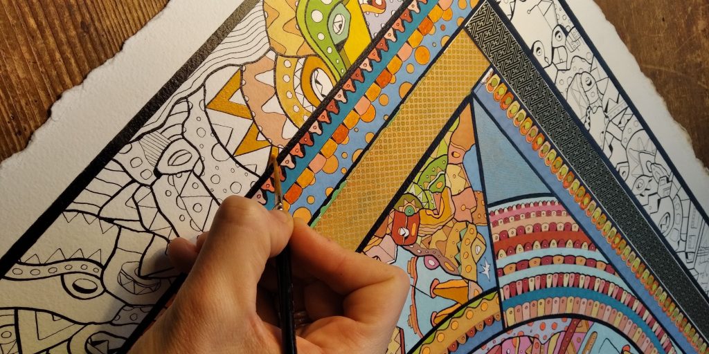 J’ai commencé avec des stylos Rotring et de l’encre de Chine. À partir de la Réunion, stupéfié par la beauté des fonds marins, j’ai commencé à mettre de la couleur. J’ai donc intégré l’aquarelle, de l’acrylique, mais aussi un peu de feutre. Comme une partie des stylos que j’utilise réagissent à la lumière, l’œuvre devient phosphorescente. Je peins au pinceau et à la plume afin d’obtenir quelque chose d’extrêmement fin. J’ai aussi pris l’habitude de réaliser mon travail sur un format Jésus, car il tient sur ma table et il s’emmène partout. Ce côté pratique est adapté aux nomades. Je limite donc mon matériel afin de voyager léger.