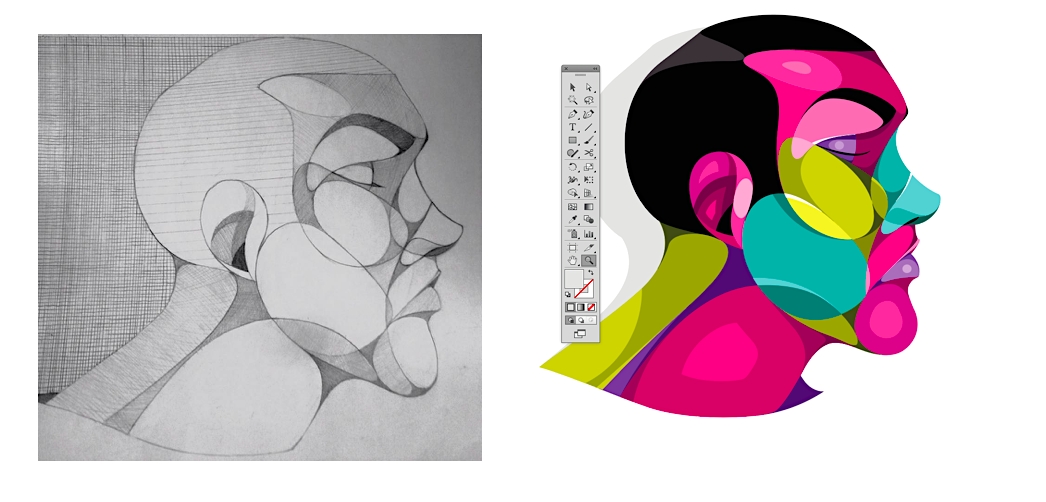 Aujourd’hui, j’ai toujours une esquisse pour préparer mon travail sur mur. J’utilise notamment le logiciel Illustrator qui me permet de redessiner mes lignes et remplir mes formes de manière assez rapide. Quand j’arrive sur mur, j’ai toujours une esquisse sur mon téléphone qui est quadrillée, puisque je travaille au carreau. C’est une technique qui permet de reproduire des petits formats en plus grand et de retrouver les proportions du dessin. Tout est préparé à chaque fois. Lorsque j’arrive sur mur, je sais exactement ce que je vais faire et quelles couleurs je vais mettre car il faut pouvoir aller vite.