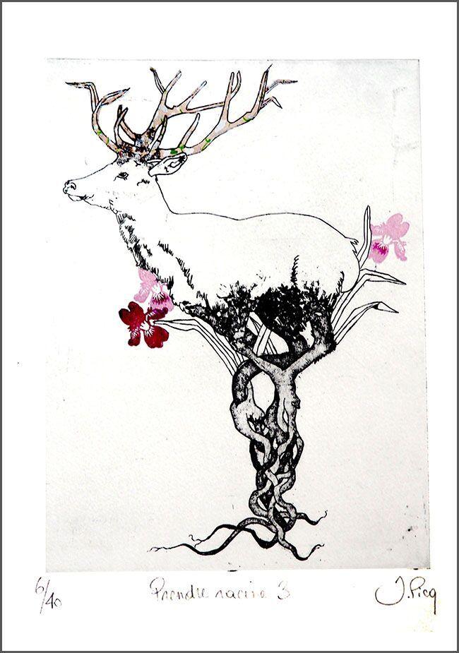 Jeanne Picq propose, quant à elle, trois séries de gravures aux représentations étranges, décalées, irréelles et pleines d’humour qui interrogent sur la place de l’homme et celle de la nature. Du boucher au masque de bœuf, en passant par le poisson coiffé de touffes végétales, ou encore le cerf aux pattes enracinées, Jeanne Picq nous fait voyager dans un univers à la fois ironique et poétique, où l’homme, la faune et la flore semblent se partager une même identité.