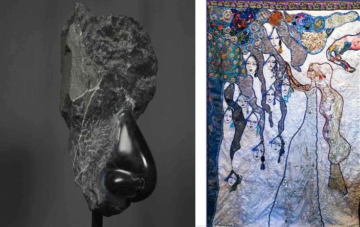 De la sculpture à l’art textile… Avec un choix d’étoffes et de matières, dentelles perlées, soies peintes et broderies les compositions d’Élodie Falgon (site ici) sont d’un raffinement extrême et d’une créativité débridée. Quel art délicat ! Hymnes à la femme, la maternité, l’amour, ses œuvres célèbrent la beauté de la vie.