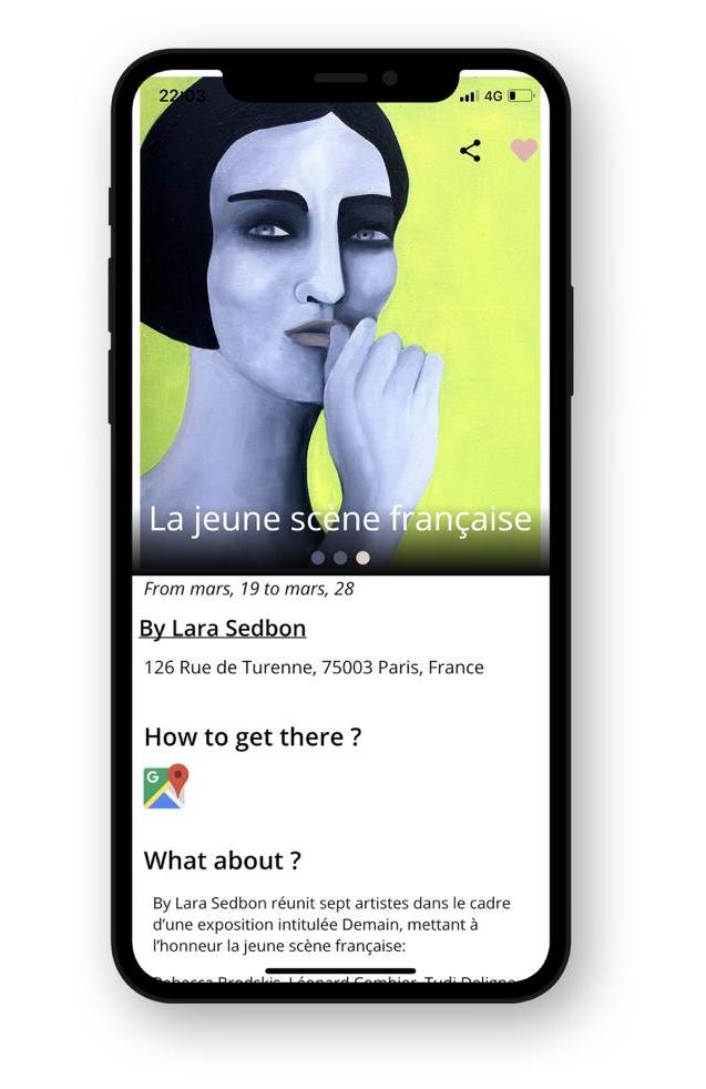 À l’instar des très populaires applications comme Instagram, Facebook ou Pinterest, Art Is HEART se présente sous la forme du réseau social. Il complète ce cocktail de plateformes d’échanges par un accès à l’art, plus précisément par un accès à l’art dans les galeries. Cette application apparait de la manière la plus adéquate pour la génération hyper-connectée. Celle-ci nous propose plusieurs fonctionnalités. Il y a d’abord la rubrique “Expositions” qui propose diverses expositions en cours et à venir. Dans celle-ci, se précise leur position sur la carte et offre une possibilité de sauvegarde. La rubrique “Recommandations” offre, quant à elle, une sélection selon les goûts (photographie, peinture, dessin, collage…). Les œuvres les plus consultées et aimées sont aussi regroupées dans une section. Enfin, une initiation simple à la collection par une rubrique de propositions d’œuvres d’artistes émergents à prix raisonnables.