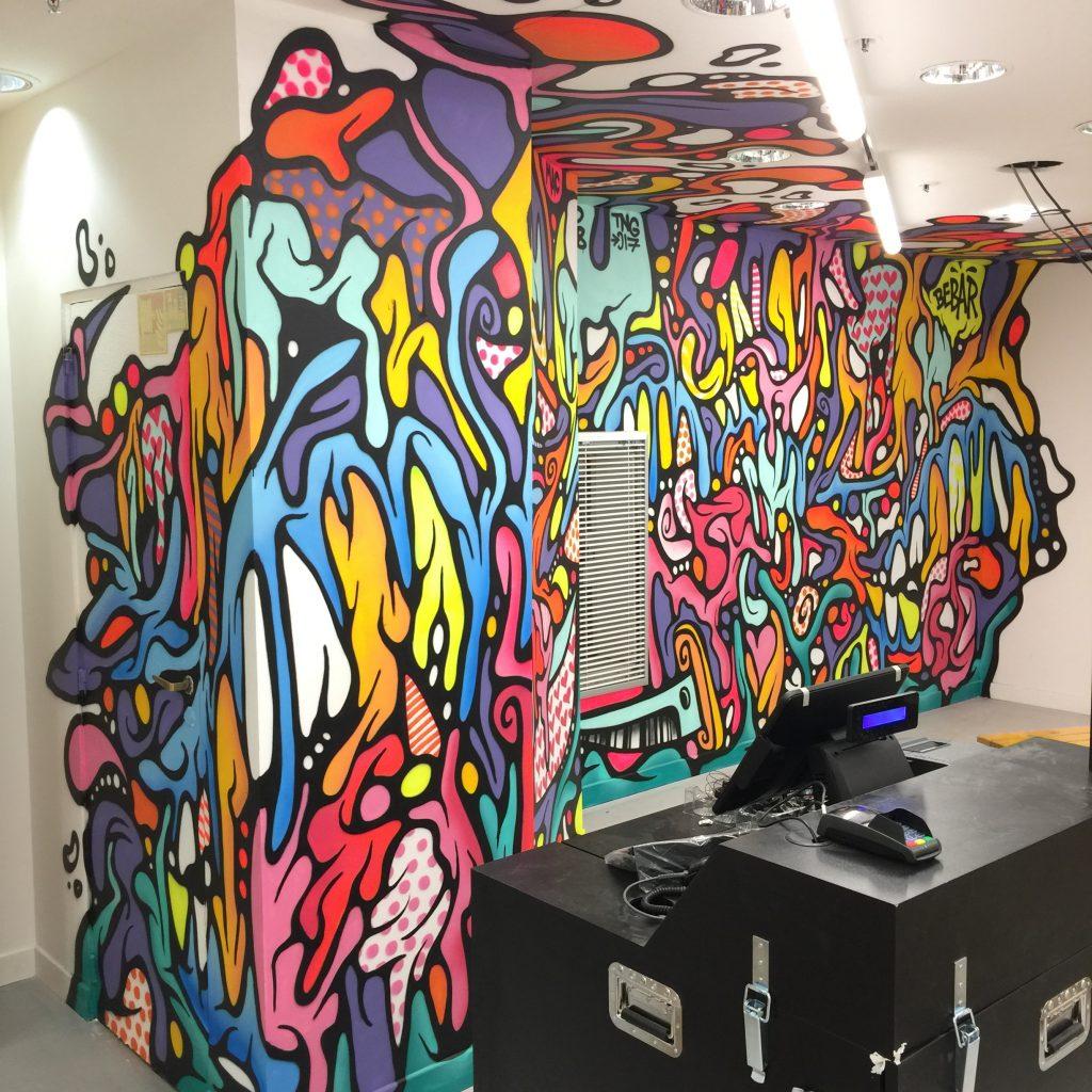 À mi-chemin entre abstraction et figuration. Si je devais le décrire en quelques mots, ce serait cartoon, dégoulinant, melting abstract, coloré, psychédélique… Quant à ma technique, je me définis par mon indéfinition ; je peux être sur peau en tatouant, en train de faire du body painting ou de la sculpture ou encore travailler l’argile. Pour être franc, je n’ai pas vraiment de technique de prédilection, même si la bombe reste une technique que j’affectionne particulièrement, et forcément les murs sont pour moi des supports les plus redondants.