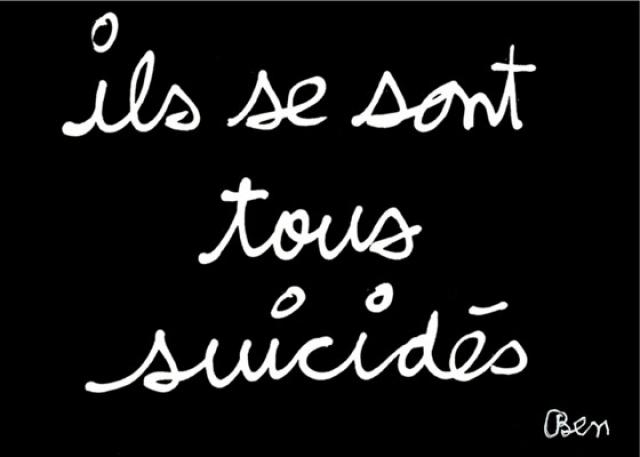 Ils se sont tous suicidés… Ben, avec qui la Galerie Templon expose depuis 1970, investit le second espace de la galerie, Impasse Beaubourg, avec une étonnante installation de photographies, de textes et de toiles sur le thème du suicide.
