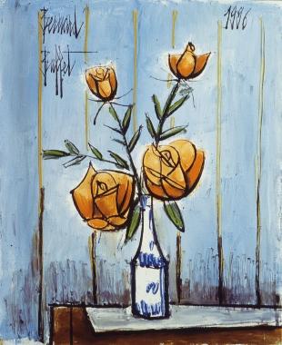 La découverte de l’œuvre de Bernard Buffet commence par une huile sur toile de 1996 représentant des roses oranges à la fragilité exacerbée et dont les contours noirs ne sont pas sans rappeler ceux de vitraux : un travail d’orfèvre, mais sur toile. Se succèdent plusieurs tableaux qui mettent en relief différents thèmes parmi ceux travaillés par l’artiste, ce dernier ayant chaque année abordé un sujet précis : les oiseaux, les régates, la corrida, les paysages, le cirque, la maison, autant d’idées représentées sous le pinceau ou la mine de plomb et exposées par cette galerie.