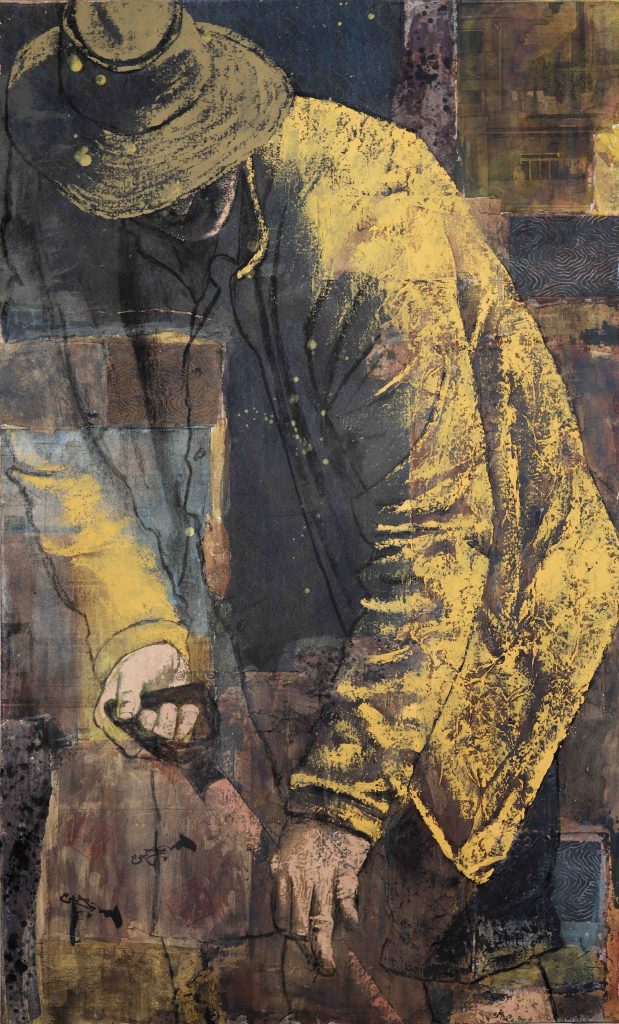 Je procède d’abord par collages, des papiers collectés, transferts ou imprimés par mes soins. J’aime animer mes fonds avec des éléments qui ont un passé (photos de paysages, emballages, papiers peints, etc.). Puis, je recouvre d’un dessin au fusain et de peinture à l’huile. Ces sous-couches apparaissent au gré des aléas du dessin, tout comme de nombreux détails, personnages ou références à l’histoire de l’art (l’œil intérieur, doigts admoniteurs…). Je laisse alors interagir les couleurs. Et je reviens plusieurs fois sur chaque tableau, dans une approche très ludique. Tel un palimpseste, cette accumulation, porteuse de sens, induit une certaine temporalité.