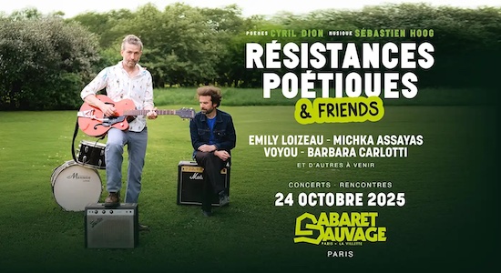Forts d’un album, d’un livre et d’une première tournée, le duo composé de Cyril Dion (textes) et Sébastien Hoog (musique) reviennent sur scène ce vendredi avec Résistances Poétiques, leur projet poétique et militant. A cette occasion, ils vous proposent une soirée spéciale où seront invité.e.s chanteur.se.s, poètes et poétesses, ainsi qu’artistes, pour résister poétiquement ensemble. Au programme : conférence, rencontres et concerts. Des performances poignantes, sensibles et engagées, à vivre au Cabaret Sauvage.