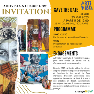 Pour soutenir nos artistes, vous pouvez aussi venir admirer la fresque d’EvazéSir, réalisée lors d’une performance en live, dans les locaux de ChangeNow, dans le cadre de la première partie du « By Night », qui a lieu ce jeudi 25 mai.