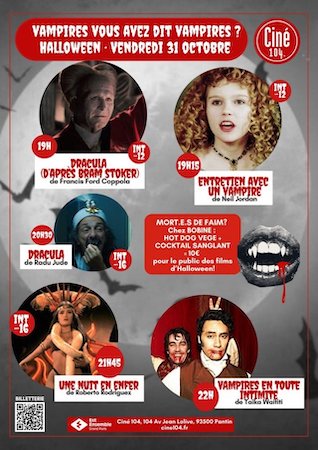 Vampires, vous avez dit vampires ? Le Ciné 104 vous propose une programmation spéciale Halloween pour toute la famille. Au programme : Hôtel Transylvanie, Twilight, Dracula, Vampires en toute intimité, Entretien avec un vampire, Une nuit en enfer