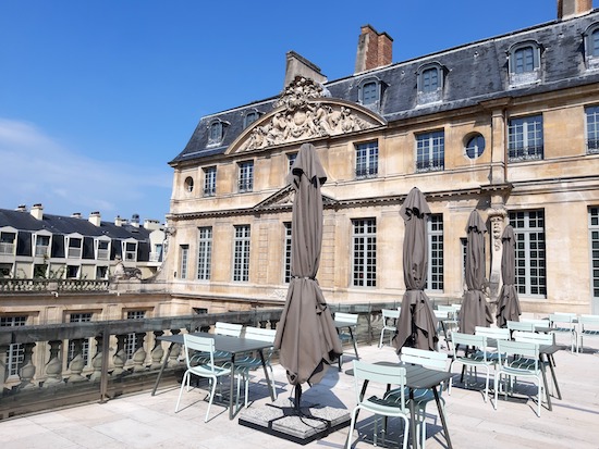 L’escalier et son ruban d’aluminium irisé guident les visiteurs vers un espace café perché au 1er étage du Musée national Picasso-Paris, Le Café sur le toit. Les tonalités et matériaux utilisés – l’ardoise, le bois naturel et laqué blanc – participent à l’ambiance apaisante du lieu. Cet espace café invite à se restaurer dans un cadre agréable. Vous pourrez vous installer à l’intérieur sur des petites tables de bar à tabourets, ou sur la terrasse, magnifique rooftop du Marais qui vous permettra de profiter d’une pause “suspendue” en plein Paris avec vue sur la somptueuse façade de l’Hôtel Salé.