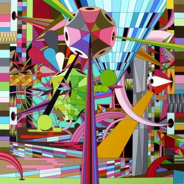 Les plus grandes toiles, au début du parcours, ont été accrochées au mur une semaine avant le vernissage. Obligeant l’artiste à travailler durant ce temps restreint du matin au soir. Dalek a donc réalisé sur place ces peintures à l’acrylique, dont les traits sont relevés au feutre noir, gage de profondeur et de teintes accentuées. L’architecture cartésienne des configurations enchevêtrées les unes aux autres, des couleurs soigneusement choisies, de la composition des tableaux, aboutit à une abstraction fascinante. Qui produit une explosion visuelle susceptible d’animer les composants géométriques en complexes rouages d’une machine fantasque aux desseins indicibles.