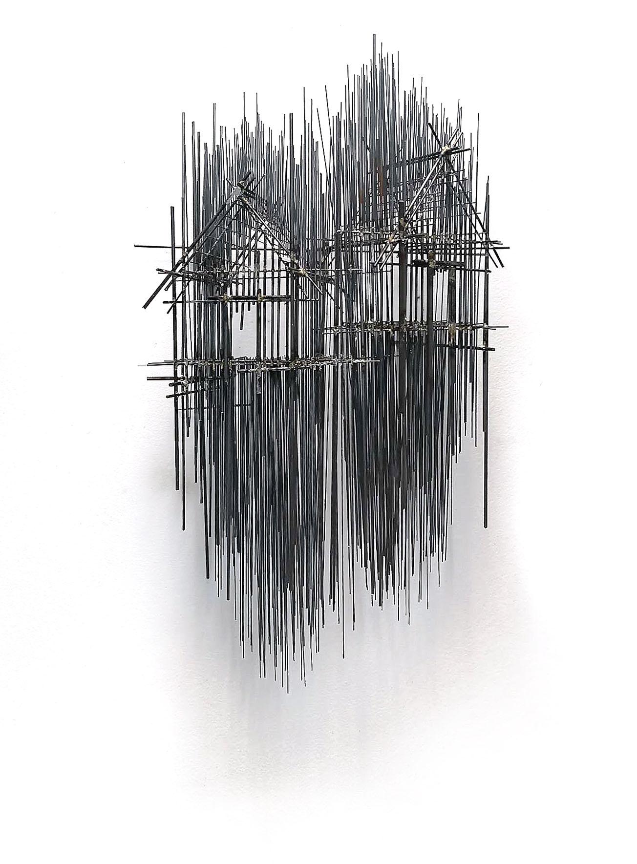 J’ai commencé des sculptures en fil il y a quinze ans par hasard pendant mon temps libre. Elles étaient trop fragiles et je suis passé au fil de fer et à la corde de piano. Quant à la maison, cela m’est venu devant un croquis : je me suis demandé comment je pouvais rendre ces deux maisons en volume. J’ai cherché la forme synthétique la plus simple pour représenter l’habitat : des murs, un toit, une porte, parfois une cheminée.