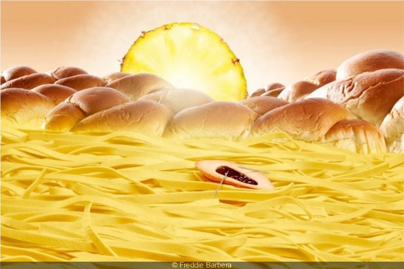 Une mer de pâtes, des montagnes en brioche, des hot-dogs en forme de fusées prêtes à décoller… Spécialisé dans la photo publicitaire culinaire, Freddie Barbera réalise de drôles de photomontages. Il en présente une trentaine dans les passages de Bercy Village.