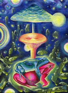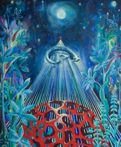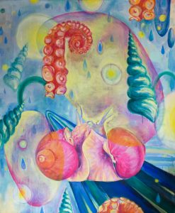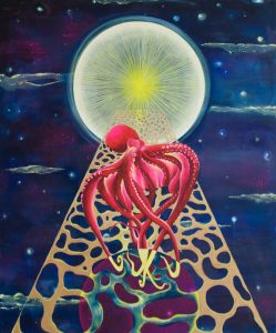 Ma peinture trouve sa source dans le psychédélisme de Jim Leon, le symbolisme de Redon, les couleurs de Bonnard et Matisse, la musique des Flaming Lips, le cinéma de Jodorowsky, les planches d’aquarelles de Ernst Haeckel ou encore les motifs colorés de Hilma Af Klint.