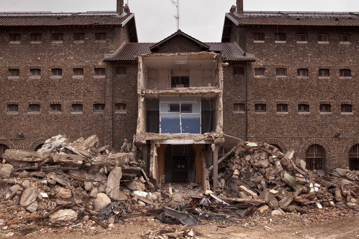 La dernière salle semble relater un temps suspendu. Les photos de destruction de la prison de la santé sont exposées, montrant monticules de meubles, de matériaux, comme si on l’avait vidée par ses fenêtres. Le processus de destruction d’un bâtiment est un moment singulier, qui nous amène à le contempler avec un oeil neuf. De nouvelles couleurs apparaissent, les façades éventrées, la structure métallique du bâtiment est dévoilée, retient des éléments dans le vide…L’artiste était également attaché à exposer les tableaux des détenus réalisées pendant des ateliers d’art plastiques, qu’il a lui même parfois reconstitué pour leur donner une deuxième vie. Il se fait l’archéologue des éléments délaissés, en reconstituant, et rassemblant. L’installation nous invite à réfléchir sur la notion de blessures et de fractures dans l’histoire des cultures et des représentations.