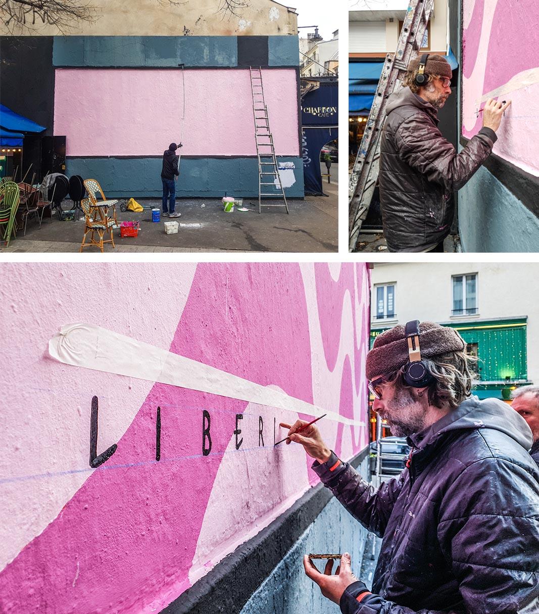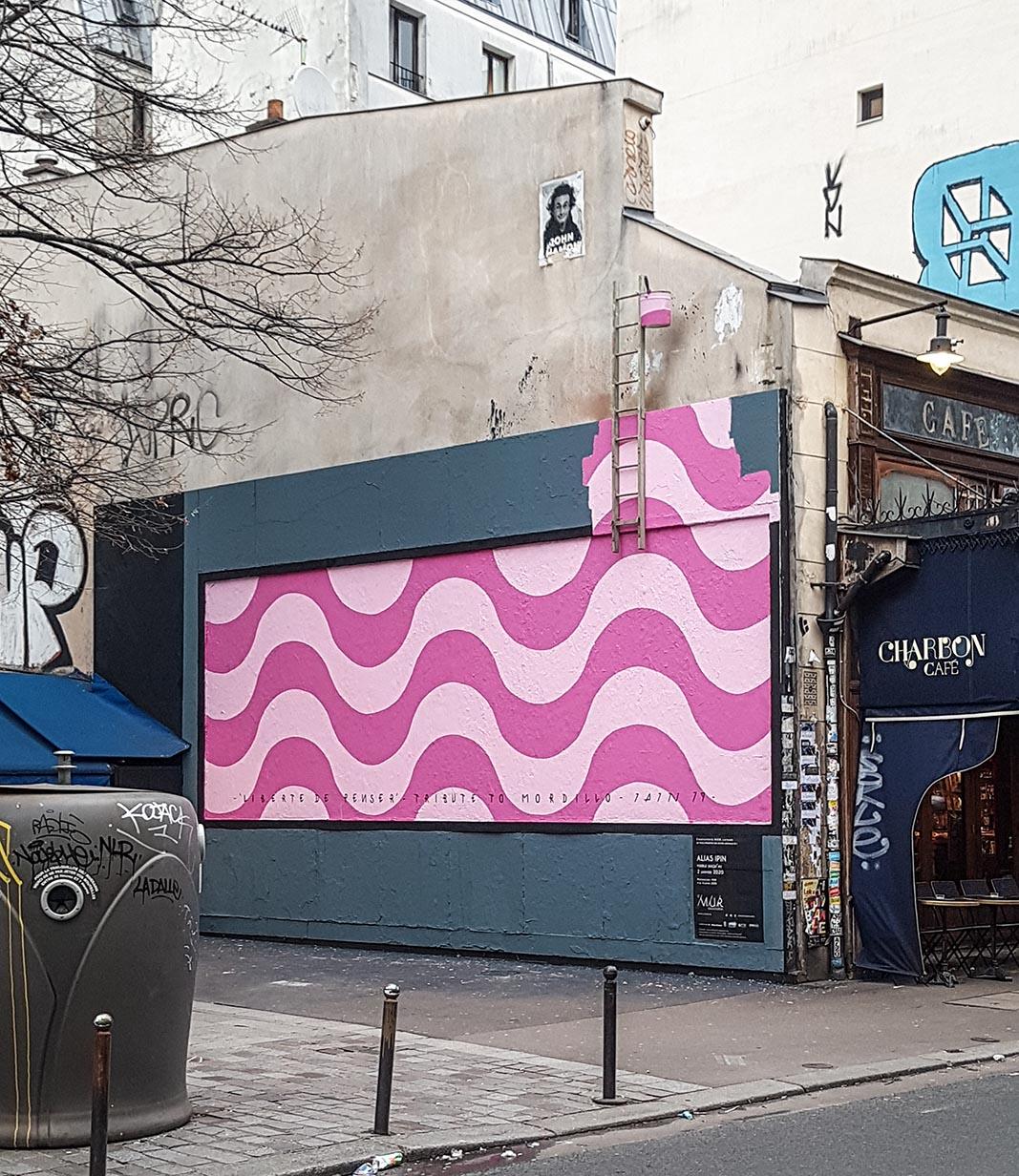 Sur l’ancien panneau d’affichage publicitaire qui borde la rue Oberkampf, Germain Ipin trace de longues vagues roses qui s’échappent du cadre gris. À première vue, la fresque ne paye pas de mine. Mais, mise en perspective avec le dessin de Mordillo dont elle est inspirée, elle prend tout son sens et dévoile, avec l’humour sarcastique qui caractérise l’œuvre du dessinateur, une ode au droit à la différence et à la liberté d’expression.