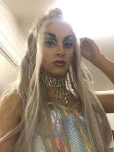 « J’ai connu le drag en regardant Rue Paul drag race. J’ai découvert la scène bordelaise et je me rend compte du manque de diversité de Rue Paul Drag Race depuis… c’est très fermé, aux personnes trans par exemple. Mon personnage, j’ai envie d’en faire une créature, je suis un Club Kid (c’est un personnage non genré, ni femelle, ni mâle, ni humain), mais rien n’est très défini, je viens de commencer le drag. »
