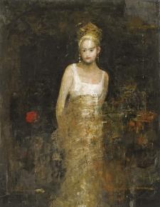 Descendue du ciel, rendue à la pesanteur des corps terrestres, c’est à l’art des grands maîtres dont Goxwa a reçu l’influence qu’Angel semble faire la révérence. À la croisée des madones russes et des icônes byzantines, enrubannées dans l’obscurité, les jeunes muses se tiennent en retrait de leur propre apparition. Précieuses présences, fragiles. Semblables à une constellation d’étoiles mortes dont la lumière court encore et dont la force de rayonnement survit à la disparition du corps, les jeunes muses, le teint clair, la mine brouillée, dévisagent leur absence. Vision scindée d’un être qui ne se donne que pour autant qu’il se retire, apparition survivant à sa propre disparition, où le revenant, au bord de l’effacement, sacrifie un instant son passé au présent. À travers le prisme de sa mémoire affective, la peinture de Goxwa est une vision débordant le visible, pénétrant le lointain. Voir loin, c’est voir dans le passé. Qu’est-ce qu’un écho sinon un appel jeté en avant de lui-même dans l’espoir de se survivre ? Le règne de tranquillité dans lequel séjournent avec grâce et majesté ces jeunes muses, filles du temps, figures virginales de l’éternel retour, laisse à penser qu’elles sont là chez elles de toute éternité et que c’est de là qu’elles nous font signe, tels les portraits du Fayoum qui comme l’écrit admirablement Jean-Christophe Bailly, « nous regardent comme d’un lieu neutre qui ne serait ni la mort ni la vie, depuis un très lointain passé qui atteint presque par miracle notre présent ».
