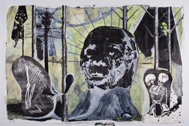 Damien Deroubaix, Bophal 2008, 2009, Aquarelle, acrylique, encre et collage sur papier, 268 x 410 cm, Pièce unique, Courtesy in situ fabienne leclerc, Paris © Marc Domage. (dessins + sculpture réalisés spécialement pour ArtParis) pour l’exposition “Appartement Saint-Germain” réunissant les galeries InSitu-Fabienne Leclerc, Hervé Loevenbruck, Jousse Entreprise, Galerie Georges-Philippe et Nathalie Vallois et Laffanour Downtown.