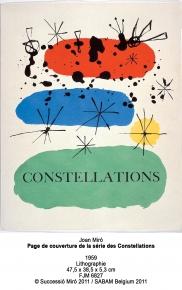 L’un des temps forts de l’exposition réside certainement dans la présentation de la série « Constellations », mystérieuses métaphores graphiques accompagnées de textes d’André Breton, lithographies aux titres énigmatiques : Personnages guidés dans la nuit par les traces phosphorescentes des escargots, Le Crépuscule rose caresse le sexe des femmes et des oiseaux… Comme dans les jeux « point à point » où nous reliions différents numéros dans notre enfance, le dessein de l’artiste apparaît peu à peu, au sein de « cette obscure clarté qui tombe des étoiles », constituée de spires, étoiles, soleils, yeux, échelles, araignées…