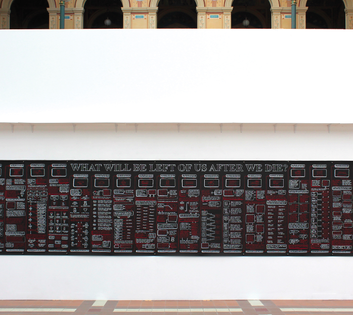 Quand on se trouve face aux œuvres, ce sont ces questions qu’on remarque en premier parce qu’elles sont écrites en grand. On voit ensuite une multitude de phrases reliées par des flèches qui forment un parcours de lecture.