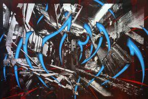 Ces friches deviennent le théâtre ou la toile de fond de ses œuvres, qui se révèle non pas dans “l’affrontement public” de la rue, mais dans l’intimité de ses pérégrinations. “Tatouage” de feu Il les traque, les visite en secret et en garde la trace grâce à des photographies qu’il transpose sur toile avant de les tatouer de son blaze tellement écartelé que les lettres deviennent autant de flammes léchant ces usines vouées à la destruction. Elles s’imposent dans leur monumentalité, s’il ne zoome pas dans la matière pour cette série qu’il a baptisée Cercle. Il s’amuse également à jouer de l’illusionnisme dans la lignée d’un Georges Rousse, et c’est alors qu’il crée des installations in situ, dérobées au regard de tous. Une façon de s’approprier ces volumes de rêve pour tout artiste.