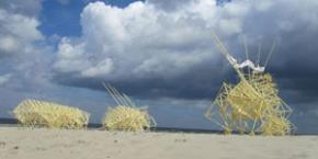A la croisée entre art, science et technologie, l’exposition « L’art robotique » à la Cité des sciences et de l’industrie présente une vingtaine d’œuvres numériques pour la plupart inédites. Parmi elles, quatre créations majeures. Pour point commun : l’utilisation des technologies robotiques ou automatisées. Quand les artistes donnent vie à la machine… Sous l’apparence initiale de la mythique Citroën DS, Totemobile de Chico MacMurtrie/ARW dévoile au bout de quelques minutes une œuvre monumentale de 18 m de haut. La DS donne l’impression d’exploser pour se transformer en un totem. Lorsqu’il atteint sa taille maximum, Totemobile laisse échapper un flot de lumière sous la forme de multiples sculptures gonflables d’inspiration organique. Le visiteur s’immerge enfin dans Falling Light,du studio d’artistes anglais Troika. Une plongée poétique dans un environnement de gouttes de lumière faites de lentilles optiques en cristal. Au plafond, les leviers mécaniques blancs s’élèvent et s’abaissent en rythme grâce à une came, approchant et ou éloignant la LED de la lentille, transformant ainsi la lumière blanche en une myriade multicolore. Sur les traces des androïdes et guerriers modernes de Star Wars à Terminator : tous les mercredis et week-ends, trois animations pédagogiques invitent les enfants à s’interroger sur l’aspect sociologique et scientifique des robots, avec pour guide, le robot Nao. Alexia Guggémos [Visuel : Theo Jansen, Animaris, 2013 © Loek van der Klis] |