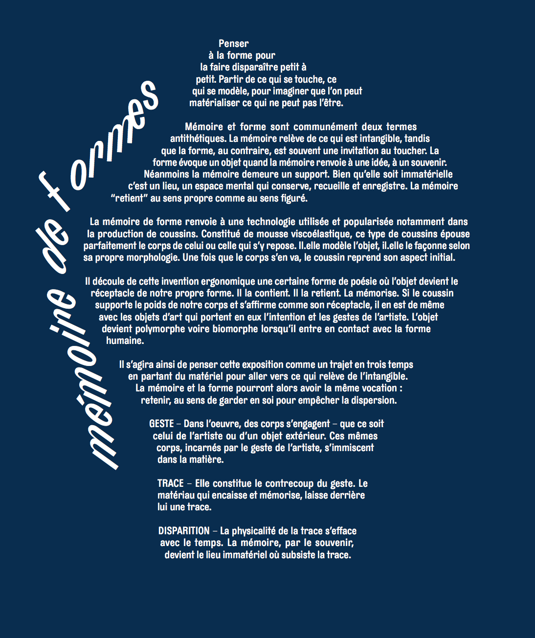 Il s’agira ainsi de penser cette exposition comme un trajet en trois temps en partant du matériel pour aller vers ce qui relève de l’intangible. La mémoire et la forme pourront alors avoir la même vocation : retenir, au sens de garder en soi pour empêcher la dispersion.