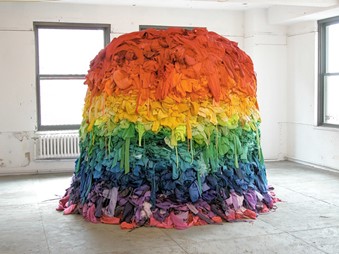 Il y a aussi le duo Guerra de la Paz, basé aux États-Unis. Ils utilisent des matériaux recyclés, en particulier des vêtements pour façonner leurs œuvres. Ils questionnent notamment notre consommation textile et l’impact qu’elle a sur l’écologie.