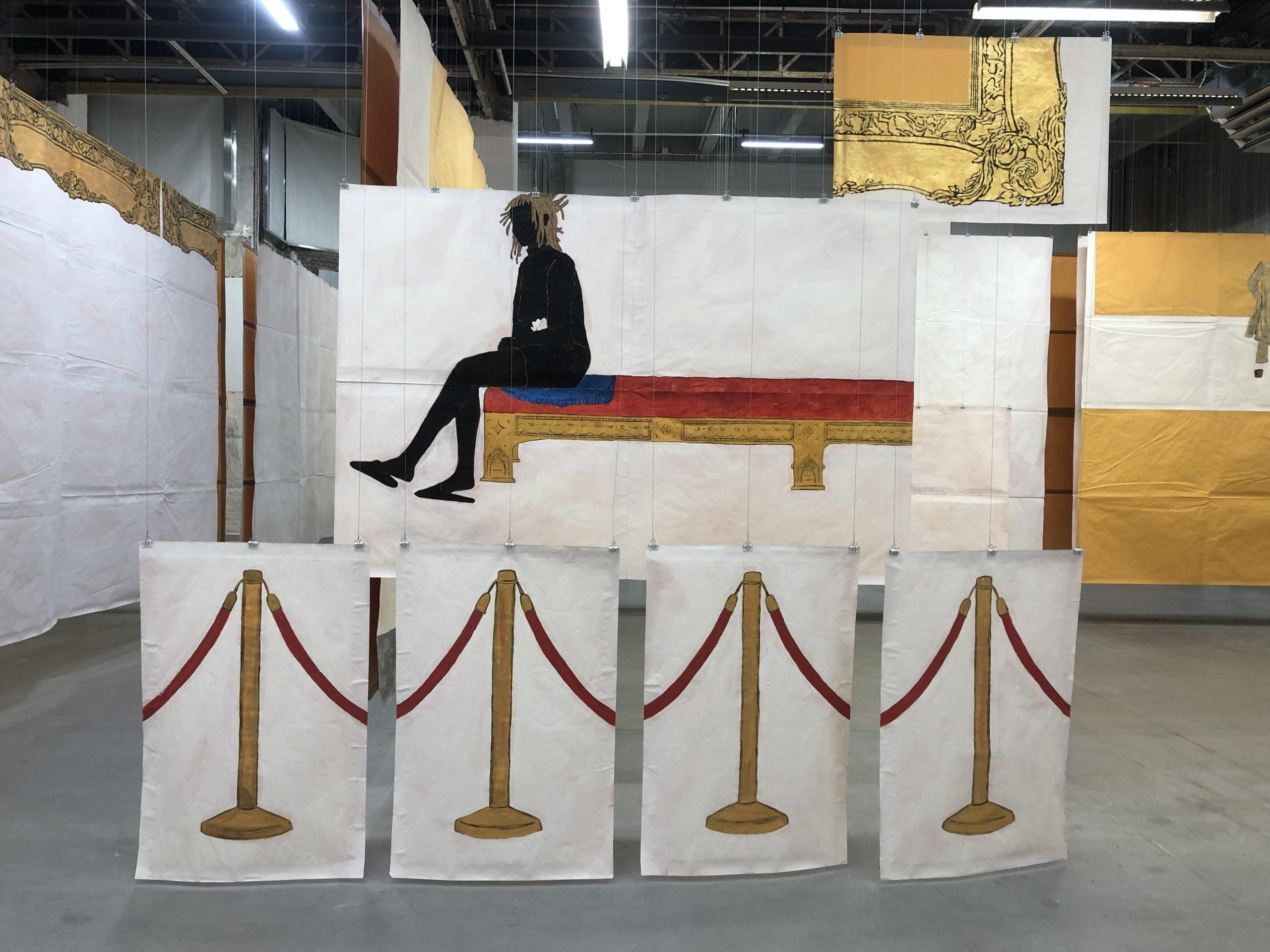 L’exposition de Maxwell Alexandre, New Power, rassemble plusieurs grandes toiles, suspendues de manière à ce que le spectateur puisse s’y promener comme s’il se trouvait dans les couloirs d’un musée.