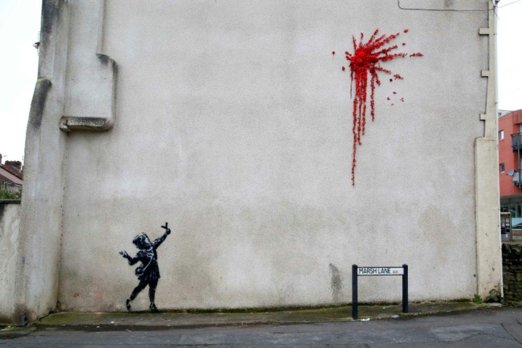 À l’occasion de la Saint-Valentin, Banksy a proposé une nouvelle fresque aux habitants de Bristol, considérée comme la ville de naissance de l’artiste. Il représente une petite fille armée d’un lance-pierre, faisant exploser une gerbe de fleurs, qui se répand en dégoulinant sur le mur.