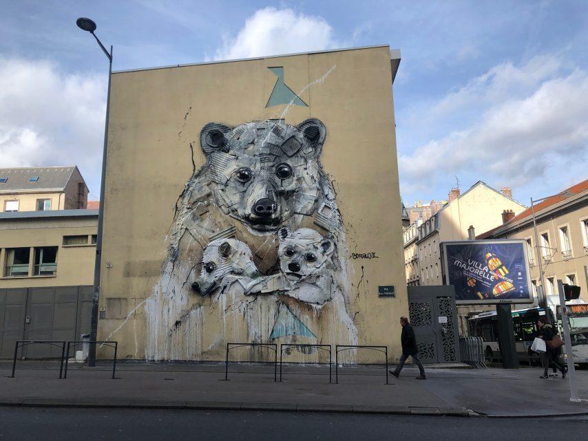 Bordalo II recycle des matériaux de toutes sortes pour réaliser ses fresques. Il a choisi de représenter trois ours polaires à Nancy, pour alerter sur l’urgence d’agir contre le réchauffement climatique. Fresque réalisée sur le mur d’une école, le message se veut fort et impactant, en s’adressant directement aux nouvelles générations.