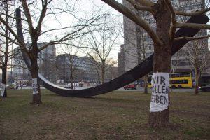 L’artiste, soutenu par l’ambassade de France, estime que les platanes gênent la vue et la lisibilité de son œuvre. L’abattage de ces arbres a déjà recensé un certain nombre de votes en sa faveur… Pour autant, le parti des écologistes de la ville ne laisse pas tomber les arbres, désormais entourés de banderoles « Wir wollen bleiben » (Nous voulons rester).
