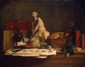 [Visuel : Jean-Baptiste Siméon Chardin, Nature morte aux attributs des Arts, 1766. Huile sur toile 112 x 140,5cm, atelier de l’artiste. Vendu aux enchères en 1855 à Saint-Pétersbourg. Musée de l’Ermitage, Saint-Pétersbourg © Photo de Vladimir Terebenin, Leonard Kheifets, Youri Molodkovets. Musée de l’Ermitage]