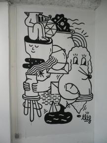 Pour ce dernier opus du cycle dédié au Street Art, l’artiste Gilbert invite les THTF jusqu’au 1er mars. Pstolë et Supapouik sont les deux « cultivateurs de crayons » issus du Street Art et qui composent le collectif THTF (Two Hands Ten Fingers). Selon la légende urbaine, ces inventeurs d’images se sont rencontrés en 2008 « autour d’un bureau d’écolier ». Leur collaboration devient rapidement fructueuse et après de nombreux coups de crayons et de barbouilles communs, ils décident de rassembler leurs récoltes, leurs neurones et leurs idées en un délire collectif : THTF est ainsi créé en novembre 2009. Leur travail est composé d’illustrations très graphiques au tracé précis, où prédominent le noir et le blanc, assortis de couleurs festives. Ce qui interpelle sur ces grands formats voués à être placardés sur les murs des villes, c’est le bestiaire mystérieux qui y est mis en scène. Ces gros personnages hybrides aux grands yeux ouverts sur un monde surréaliste et composé de formes géométriques évoluent avec leurs corps tout en rondeur dans un univers inspiré et inspirant, où le dessus se mêle au dessous, où le dedans se superpose au dehors, dans de complexes compositions. Ces joyeux et souriants êtres étranges débordent d’un monde imaginaire et pittoresque qui explose dans la ville, apportant gaieté et humour à notre univers bétonné. La poésie urbaine des THTF nous entraîne ainsi dans un cosmos hallucinant où l’on perd nos repères, l’espace d’un moment. C’est toute la magie du Street Art dont l’empreinte graphique fleurit partout autour de nous.