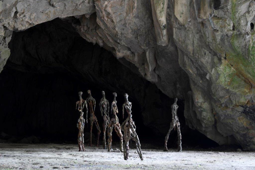 Les Larmes de l'éléphant, 2019. Ciment, ferraille et fibres végétales, 6 sculptures de 3 mètres chacune, Grotte de Bédeilhac. © Luc Jennepin