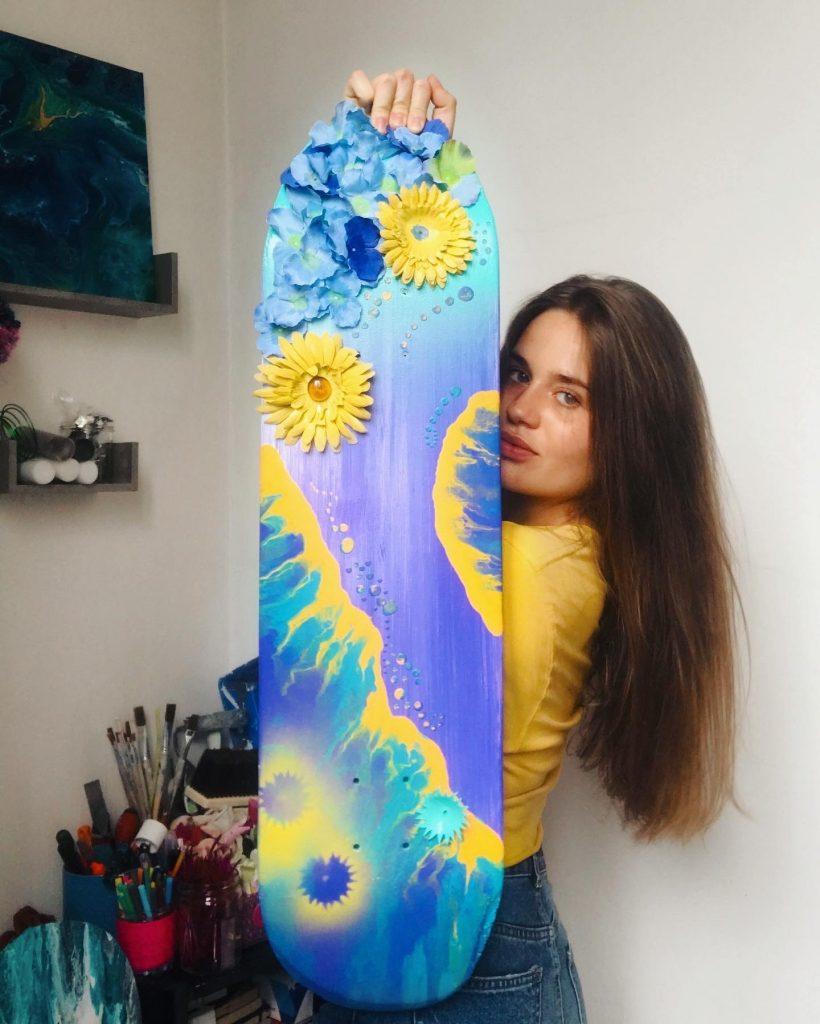 Pour les skates, comme pour d’autres supports, j’utilise plusieurs techniques ; le pouring et le dripping. Ces techniques sont à base d’acrylique, je fabrique moi-même ma peinture en y rajoutant des ingrédients (classés top secret). J’ai mis longtemps à perfectionner mes recettes.