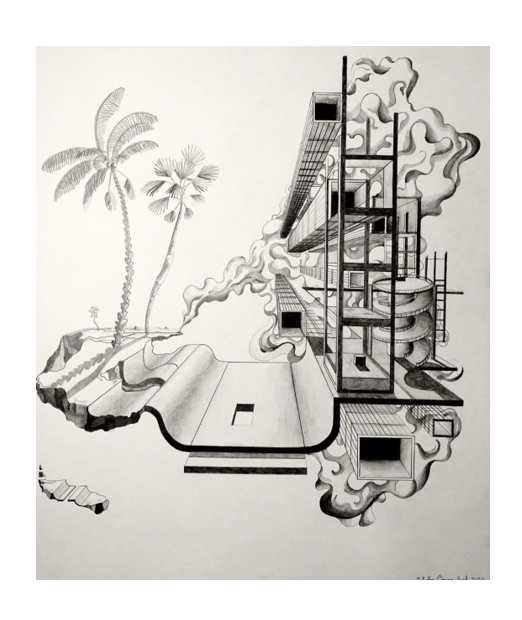Avec Entre réalité et fiction, deux portes et un voyage spatio temporel de la collection “Le Voyageur Imprudent”, on peut observer le dessin préparatoire en bas à gauche. C’est le dessin original que j’ai fait en Afrique, en noir et blanc, sur mon petit carnet de dessins. J’ai décidé de travailler davantage la matière, je trouvais mes tableaux trop traditionnels, donc j’ai collé des morceaux de toile pour construire mes palmiers.