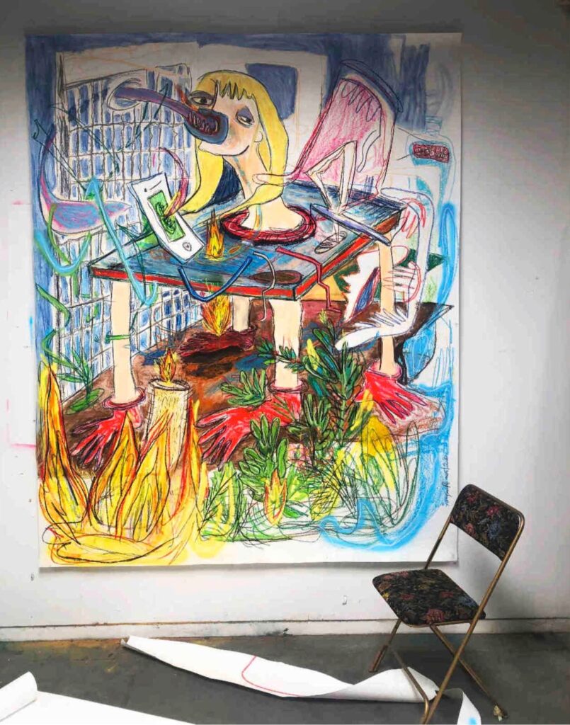 La démarche de l’architecture nourrit ma pratique d’artiste pluridisciplinaire mais il y a des artistes qui vont nourrir mes créations comme par exemple Paul McCarthy, Tracey Emin, Joseph Beuys, ou encore des auteurs comme Michel Houellebecq, André Breton, mais aussi la musique trap. Je m’inspire de personnages liés à des faits politiques, de notre scène actuelle, des réseaux sociaux. Il y a tout un mélange de strates qui constituent notre culture contemporaine, qui inspire mes productions et mon travail.