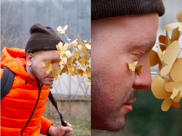 Installation sculpturale, mise en scène d’un personnage représentant un paysage social, celui du quartier de Barbès à Paris dans le XVIIIe arrondissement. L’homme, représenté sous les traits de l’artiste, tire une embarcation sommaire, telle celle utilisée par les migrants clandestins venant de toute l’Afrique. Le radeau de fortune coule. À son bord ne reste plus que les vestiges de ce que ces êtres humains ont été. Vêtements. Eau. Doudou… L’homme tirant à bout de bras la barque ; seul réchappé de ce périple à la fois unique à son échelle individuelle et également d’une banalité sans nom dans la globalité ; porte sur ces épaules un sac à dos contenant des cartouches de cigarettes, symbole de sa survie future de l’autre côté. Devant son visage, une nuée de papillon, couleur d’or, se ruant sur lui. L’illusion masquée par le rêve aveuglant. L’œuvre a pour vocation d’être installée de manière clandestine au pied du métro Barbès.