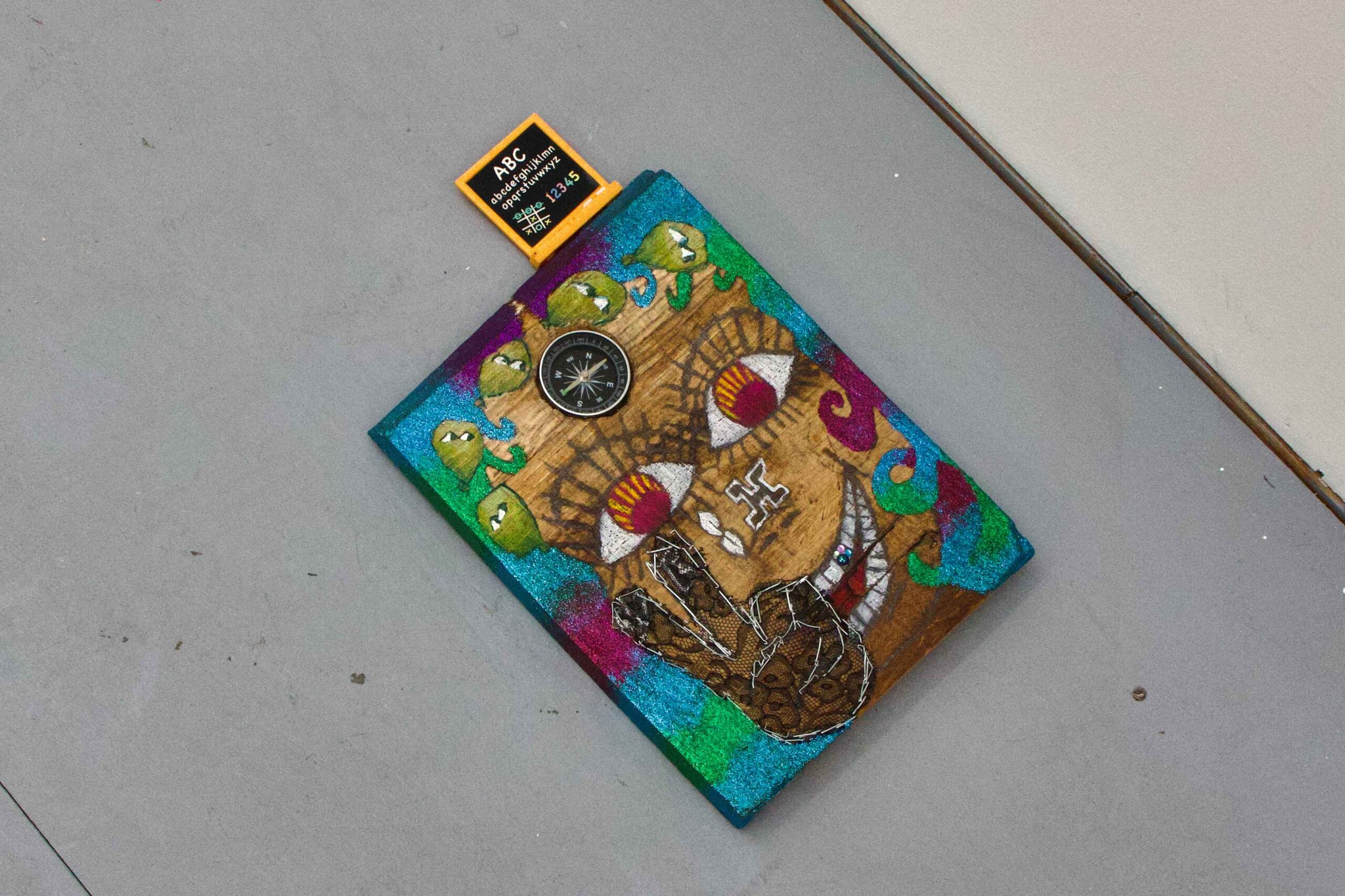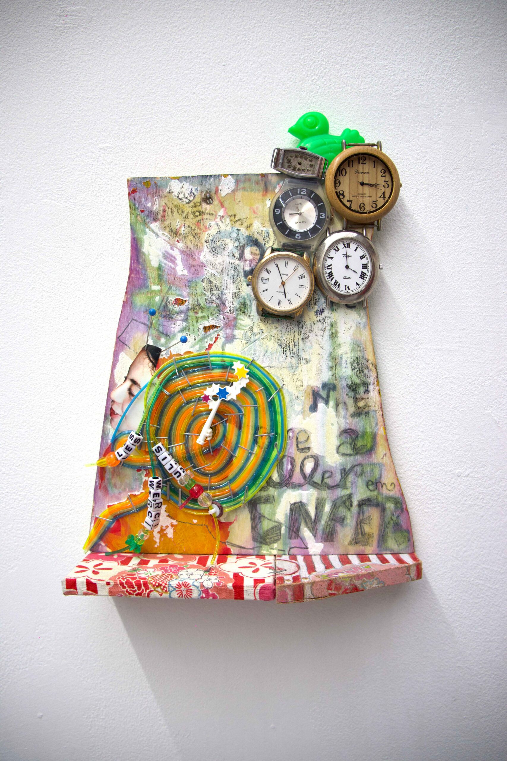 L’artiste accumule les objets qu’elle trouve et qu’on lui offre car ils sont tous chargés d’une histoire et d’une symbolique forte. Cela lui permet de les réutiliser sur des compositions artistiques. Les matériaux sont accessibles et “pauvres” car de récupération, elle peut, par exemple, travailler au crayon de couleur sur des planches en bois et coller un scoubidou.