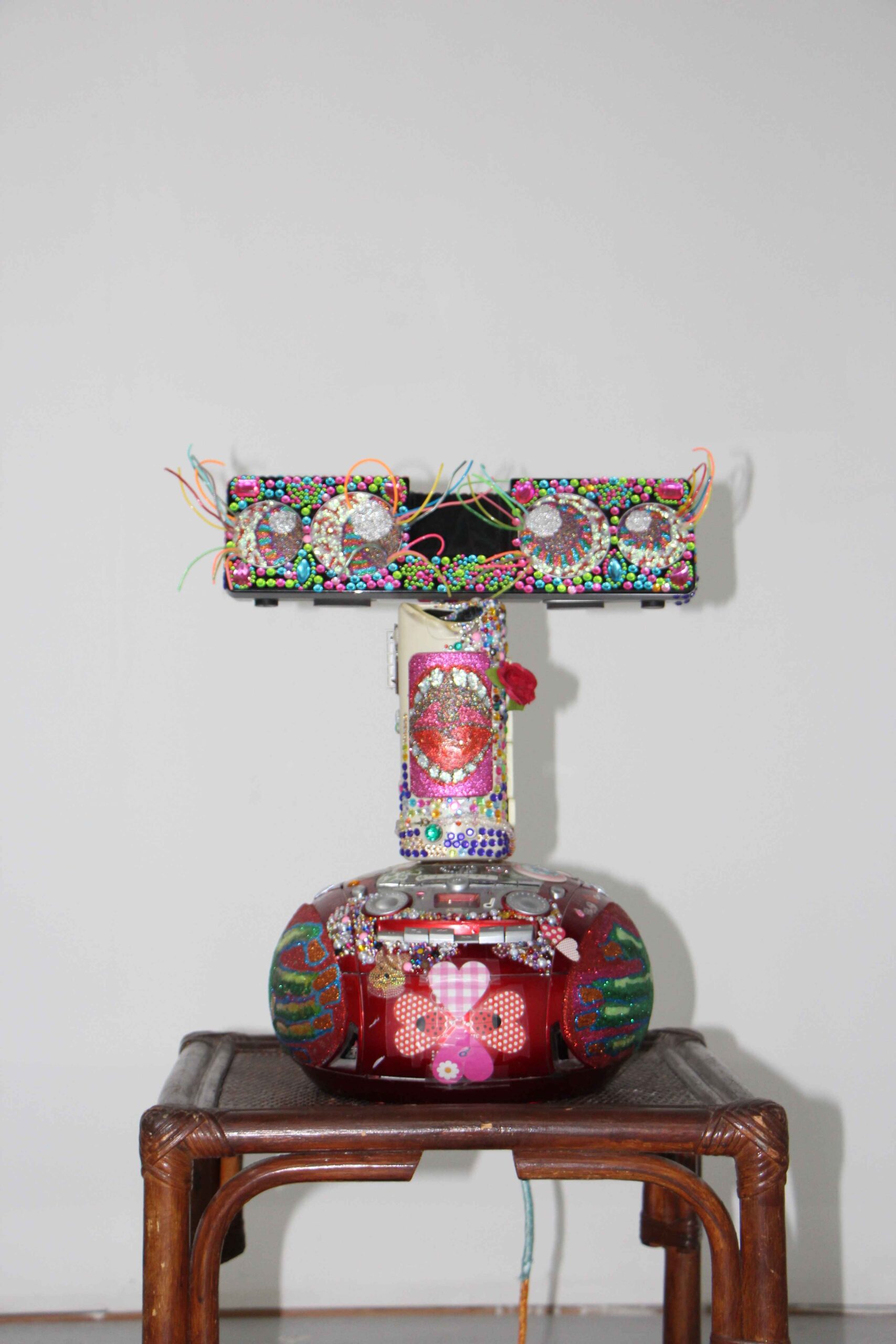 Myriam procède par collage et assemblage d’éléments récupérés en brocante ou en ressourcerie. Les médiums qu’elle utilise sont multiples, allant du bois, du papier jusqu’au textile. Myriam grâce à ses médiums expérimente les textures, les dimensions et les couleurs tout en parlant de soi. La mode fait partie intégrante de son univers artistique où là aussi la récupération et l’upcycling sont au centre de sa démarche. Cet art “cheap” et accessible est assumé et Myriam arrive à nous en montrer sa richesse. La saturation et les accidents sont justement un vecteur de création.