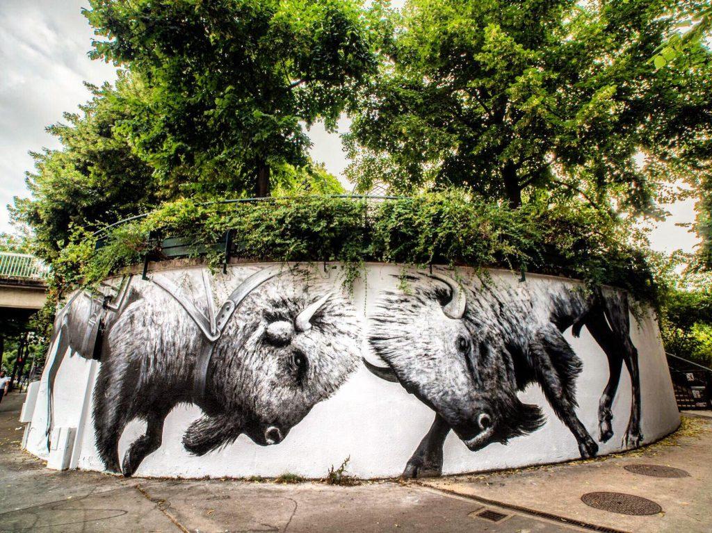 Il faut être bien préparé : la première ébauche est digitale pour étudier les options du mur et les interactions avec l’environnement. Je préfère intégrer mon travail avec le fond plutôt que de l’imposer, c’est pourquoi je peins des murs monochromatiques. J’essaie de réduire autant que je peux l’utilisation de matériel. Je trouve cela plus écologique et pratique.