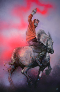Avec les nouvelles règles de vie en société et les obligations que nous devons respecter, je ne pense pas être le seul aujourd’hui à vouloir tourner la page et respirer à nouveau comme avant. En représentant un homme à cheval s’éloignant du spectateur, j’ai voulu transmettre ce sentiment d’évasion dont je rêve régulièrement. Ce cavalier vu de dos semble être déterminé à s’évader, brandissant une bombe de peinture vers le haut, comme s’il appelait les autres à le suivre dans sa quête de liberté. À la manière du peintre William Turner, j’ai réalisé un fond tourmenté et flou, illustrant alors l’incertitude de notre avenir. Le sujet central est alors mis en valeur par cet arrière-plan vaporeux.