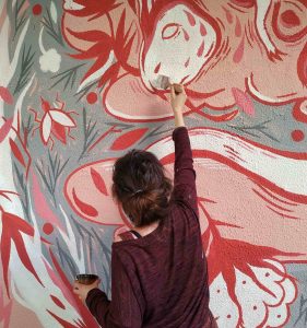 J’ai suivi des études d’art à l’université polytechnique de Valence, grâce auxquelles j’ai pu passer six mois en Erasmus à Florence, avant d’entreprendre un master à Valence pour enseigner le dessin. Suite à cela, j’ai entamé une maîtrise en illustration à Grenade que je n’ai pas terminée mais qui m’a permis de commencer à forger le style graphique que j’utilise aujourd’hui. Ces dernières années, j’ai beaucoup travaillé sur des projets liés à l’illustration (livres, posters, pochettes…) mais sur la dernière année, je me suis pas mal concentrée sur l’art urbain. C’est un mode de travail que je trouve très intéressant. J’aime dessiner chez moi, avec ma tablette graphique, mais quand on réalise des fresques il y a tout un travail physique, un échange avec les passants, il faut s’adapter à l’environnement urbain, il y a aussi une certaine forme de liberté de création et d’improvisation. En tout cas moi, c’est comme ça que je le vois. C’est un courant artistique dont j’aime vraiment beaucoup le procédé.
