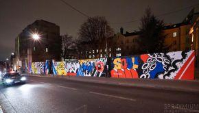 spraymium-rcfbaudouin06«J’ai abordé ce mur comme une rétrospective personnelle. Un hommage au graffiti, aux lettrages, aux tracés directs. Je voulais que cela ressemble à un carnet de croquis, avec des lettrages épurés réalisés directement en contour noir. La première partie nous ramène en 2006, lorsque je peignais les trains de la ligne Nord. «Fetish» était l’un des noms que j’utilisais sur les «petits gris». C’est un nom qui m’a coûté cher lors de mon procès en 2008. Mes lettrages avaient alors un côté plus «new-yorkais» que ce que j’avais l’habitude de faire. Sur cette partie, on retrouve la motrice Z.6100 chère aux amateurs de trains gris ainsi que quelques éléments de la culture Mod comme le damier ou la cocarde anglaise.»