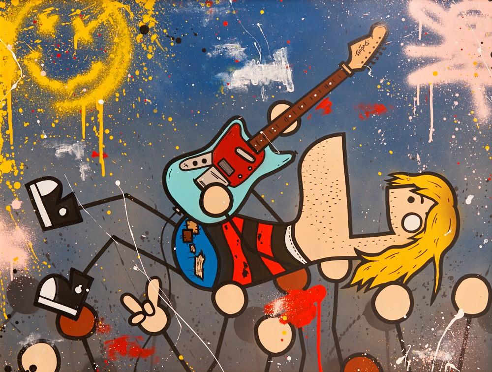 Pour cette exposition, j’ai travaillé sur le thème de la musique. Ensuite, la variété des supports s’est imposée d’elle-même. J’ai travaillé la majorité de mon exposition sur toile, mais ça me paraissait évident de faire des peintures sur pochettes vinyles, partitions, instruments de musique, etc. Le choix de ce thème m’a vraiment aidé à diversifier mes idées et à créer un rythme tout le long de l’exposition.