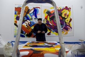 Rime débarque de New York et a transformé la galerie Wallworks en atelier, le temps de préparer son exposition du mois d’avril. L’occasion unique de rencontrer le graffeur américain et de plonger dans son univers baroque décadent peuplé de héros déchus et surtout porté par l’humour de l’artiste. Au départ, il y a l’obsession d’écrire son nom avec la précision du trait, de la lettre, de recommencer sans cesse pour que ce soit juste. Il ne signe pas encore Rime. Lorsque Jersey Joe dégaine ses premières bombes dans les rues de Statent Island en 1991, cet artiste en herbe né en 1979 signe ses interventions Onea. C’est quelques années plus tard qu’il inventera son blaze, fasciné par la manière dont deux grapheurs avaient dessiné deux lettres, respectivement un R et un E. Son nom commencera par R et se terminera par E, tel était son postulat. Il aurait pu garder Rule, mais ce sera Rime, qui évoque la poésie.